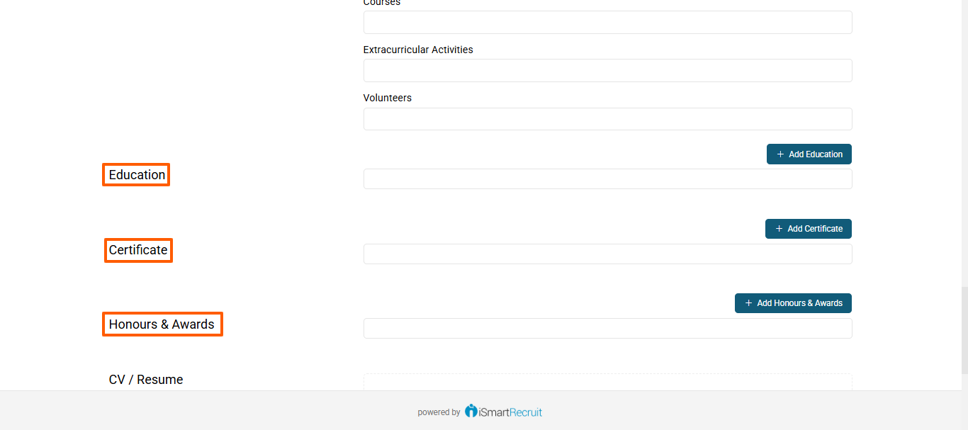 Education, Certifications, Honours & Awards, Courses, Extracurricular Activities, and Volunteers.