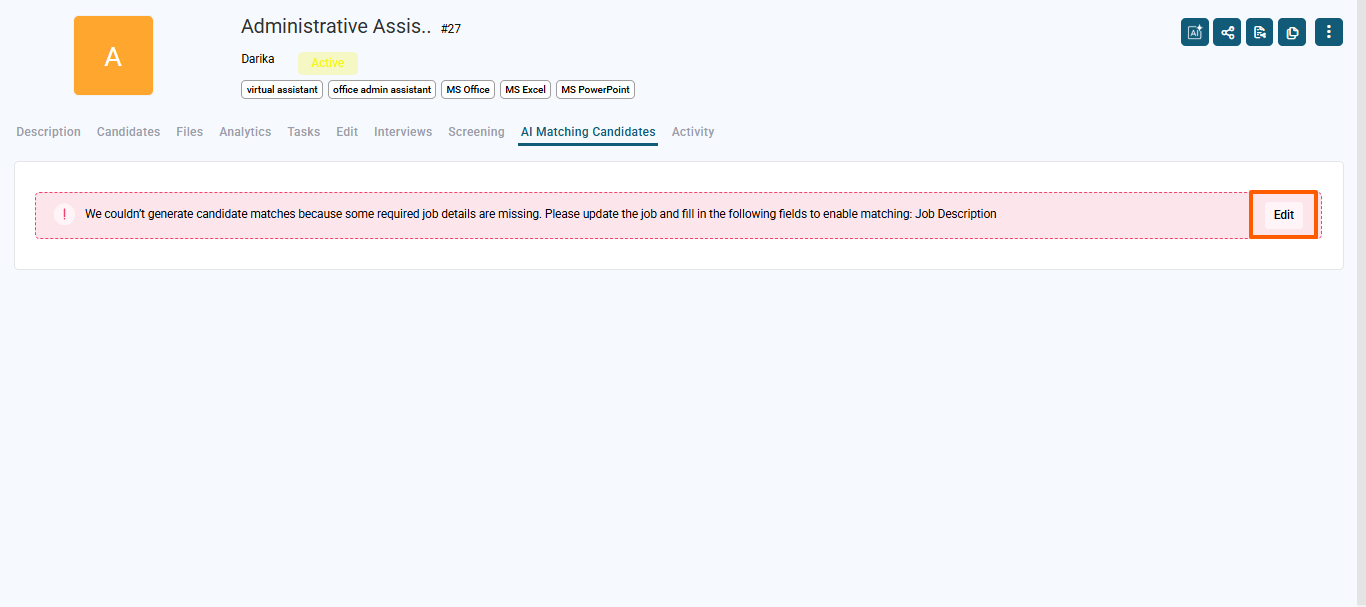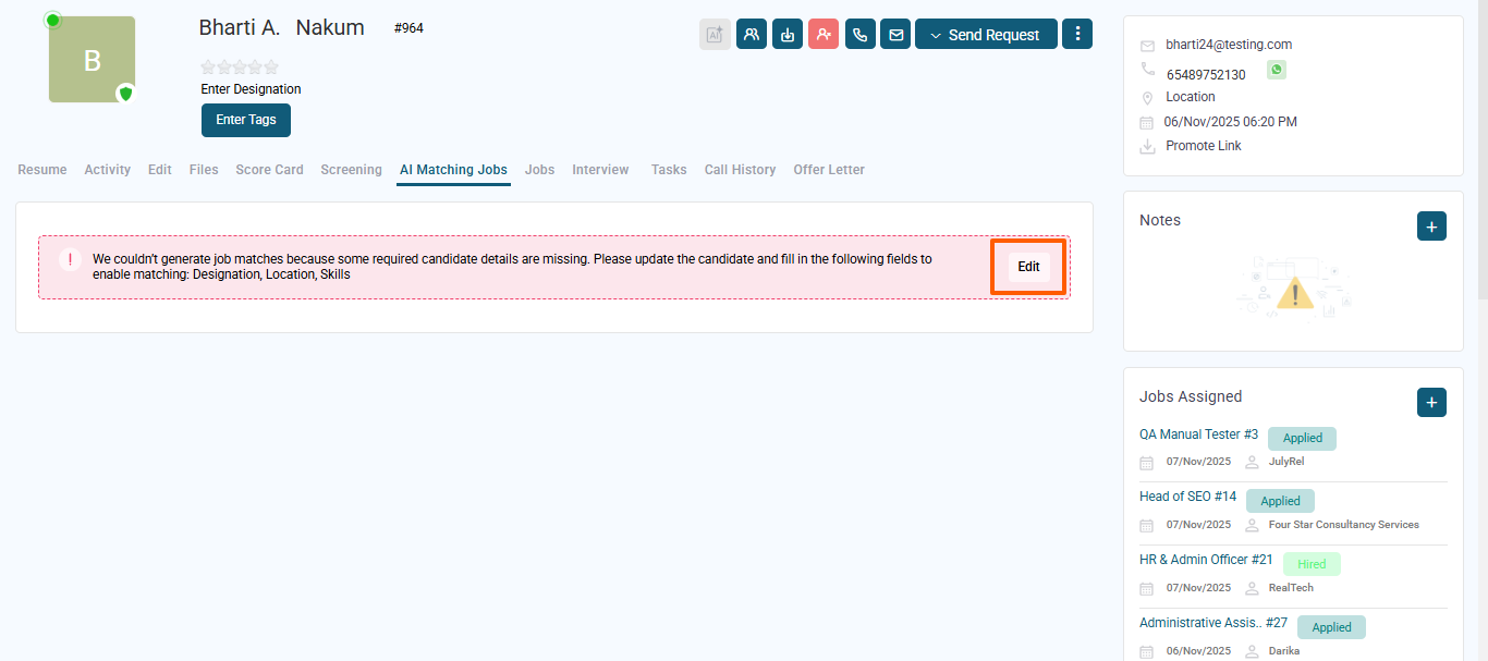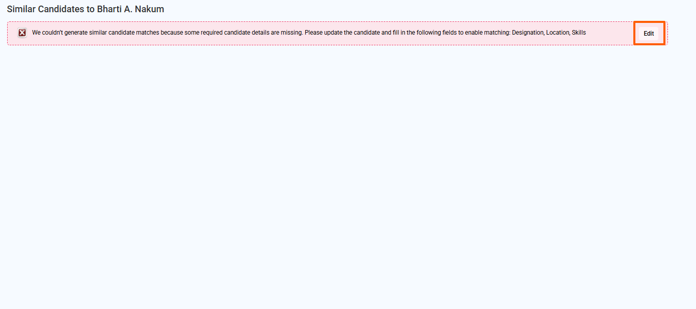 When running AI Job Matching or Similar Candidates, users will now see clear validation messages if key fields like Designation, Location, Skills, or Experience are missing.